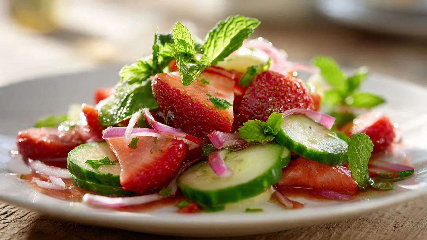 The star ingredient here definitely sits between the cukes and the berries: fresh mint. That mint lifts the whole bowl and makes every bite sing. By the end of this article, you’ll get a clear ingredient list, step-by-step method, pro tips to avoid soggy salad, tasty variations, and smart storage ideas. I’ll also share the little things I learned the hard way (like don’t slice strawberries into mushy flakes—lesson learned).