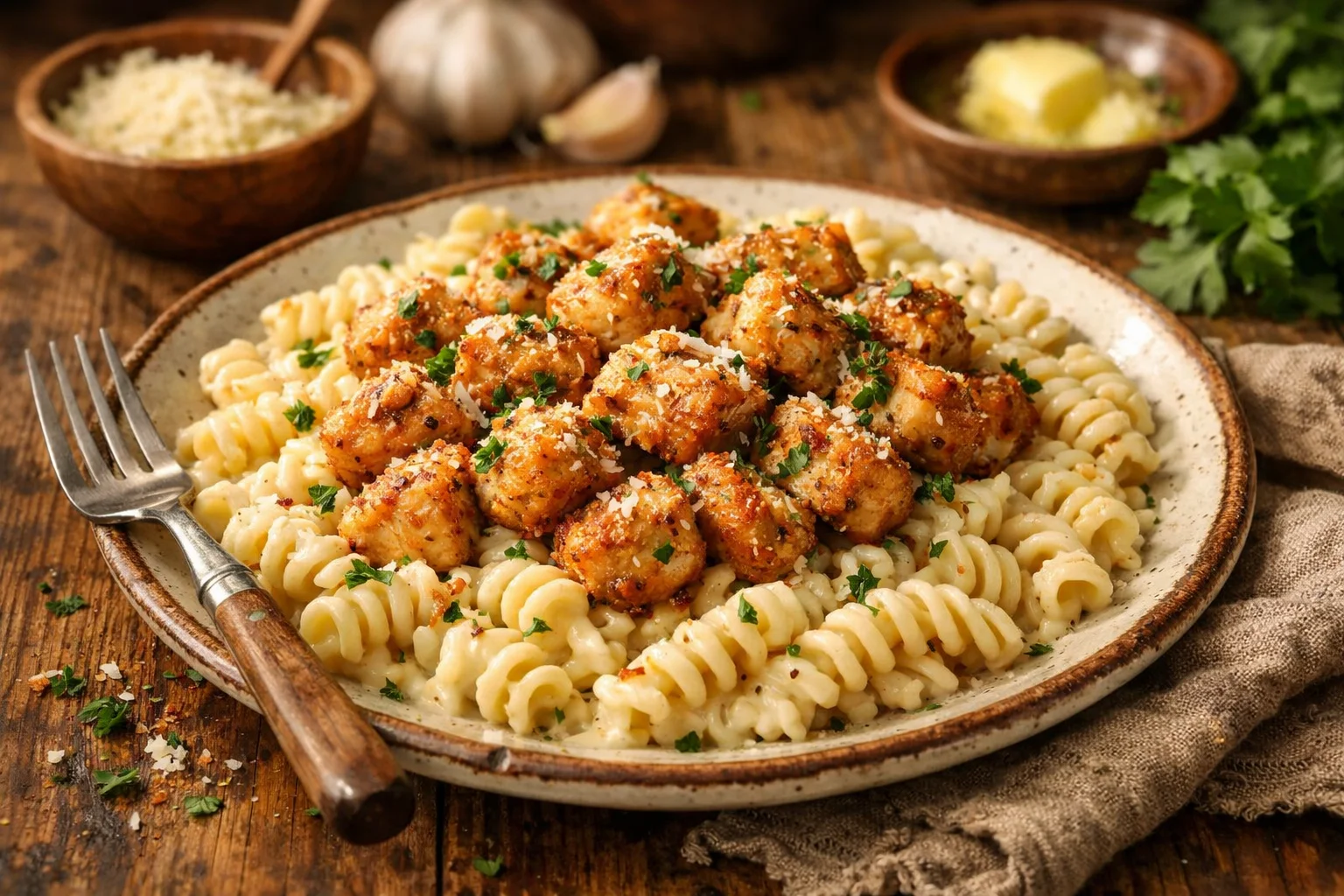 Garlic Parmesan Chicken Bites with Creamy Rotini